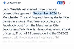 格拉利什通过社媒晒出了自己搜索自己上次连续3场首发的信息,显示他上次连续3场首发还是2024年9月。他对此点评道:“终于又能连续3场首发的感觉真棒!”