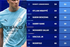 自哈兰德首秀以来欧冠进球榜:哈兰德50场52球居首,莱万次席