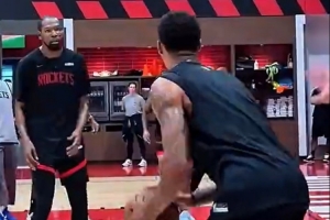 这就是硬解能力!火箭训练:KD&小贾撞墙式配合 前者干拔中投打进