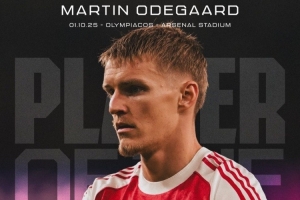 实至名归!厄德高当选本轮欧冠阿森纳队内最佳球员