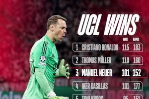 诺伊尔欧冠取胜101场并列历史第三多,仅少于C罗、穆勒