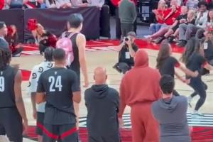 太喜感了!杨瀚森全神贯注模仿啦啦队跳舞 粉色书包真显小又吸睛