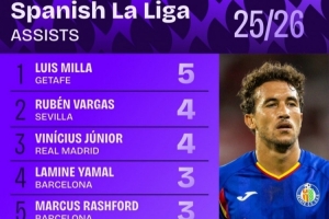 西甲助攻榜:维尼修斯并列第2 亚马尔、拉什福德、居勒尔并列第4