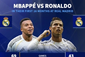 效力皇马前16个月数据:姆巴佩69场58球7助,C罗43场36球13助