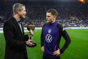 上赛季45场16球15助!维尔茨今日赛前领取德国足球先生奖杯