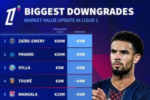 法甲球员身价下跌榜:扎伊尔-埃梅里、帕瓦尔、希拉-500万欧居首
