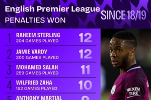 18-19赛季以来英超造点榜:斯特林、瓦尔迪12次最多,萨拉赫11次