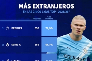 五大联赛外籍球员占比:英超70.9%最高,西甲43.3%最低