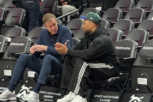 曾共事9年!勇士助教斯托茨和昔日爱徒利拉德赛前场边聊天