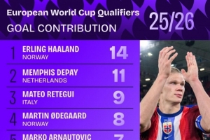 本届欧洲世预赛参与进球榜:哈兰德14球居首,德佩11球次席