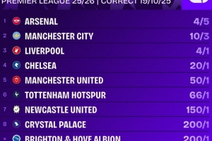 英超联赛 25/26 赛季冠军赔率 (数据截至25年10月19日)