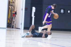 湖人队内训练视频:一对一激情对抗 佩林卡围观 文森特模仿走步