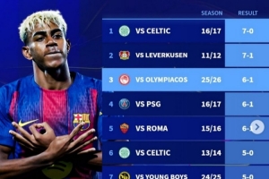巴萨队史欧冠最大比分胜利榜:7-0凯尔特人居首,本轮6-1第三