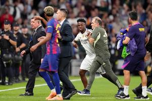 亚马尔走近场边时,维尼修斯走过来对他做了“话太多”的手势,两人发生争吵。皇马门将教练略比斯试图将维尼修斯拖回球员通道,但这位巴西人开始冲向亚马尔,被皇马四名工作人员拦住。拉菲尼亚跑向国家队队友维尼修斯,被皇马的巴尔韦德及时制止。