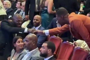 老搭档🫶詹姆斯抵达名人堂现场,与前队友波什开心握手~