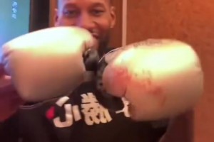 威姆斯赢下和恶鼠的八角笼战之后 直播间展示拳击手套上的番茄酱