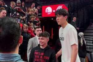 很受大家喜爱啊🥰杨瀚森赛前为热情的开拓者球迷合影、签名~~