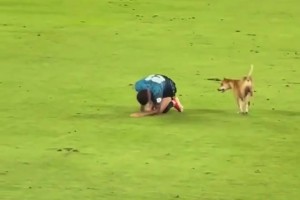 狗狗进场模仿球员受伤倒地…伤害性不大,侮辱性极强啊😅